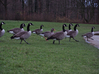 A gaggle of canada goose (branta canadensis) and one graylag goose (anser anser) walking towards the water in the Rheinaue park in Bonn, Germany