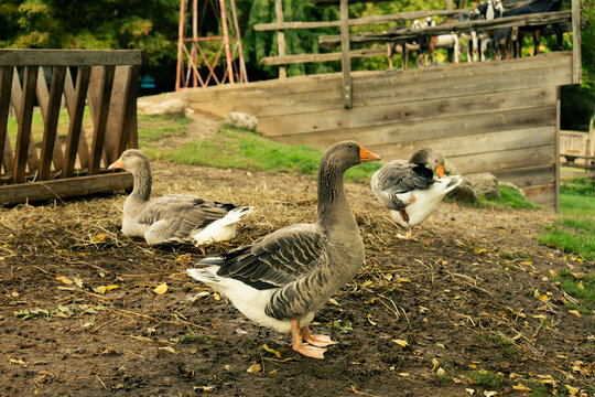 Gaggle of domestic geese near the coop in late afternoon. Rural farm. Selective focus.