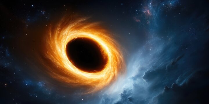 Supermassive Black Hole Surrounded by Accretion Disk of Glowing Plasma in Outer Space. Illustration of Black Hole Event Horizon. 3D Render.