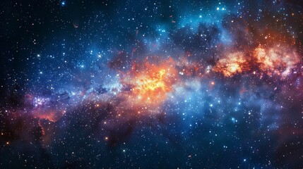 Wide view of a star-filled galaxy with numerous white, blue, and orange stars scattered across the dark night sky creating a sense of vastness and mystery