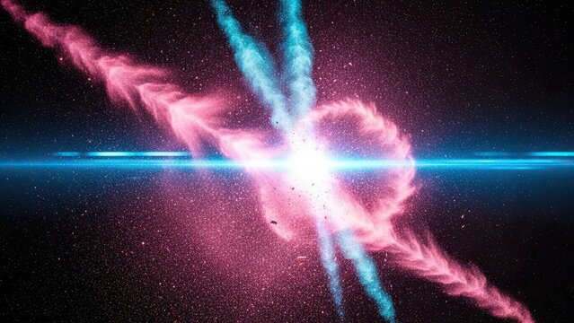 A vibrant particle explosion radiates from a glowing core within a dark cosmic atmosphere