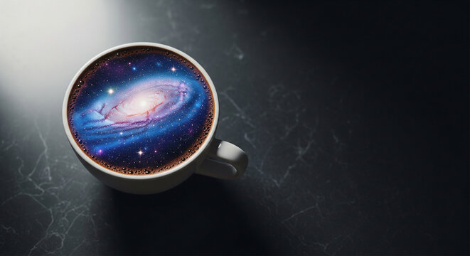 Galaxy and stars reflected in a cup of coffee for creative vision