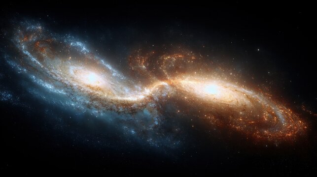 A captivating illustration of interacting spiral galaxies, showcasing swirling patterns and vibrant hues against a vast expanse of deep space.