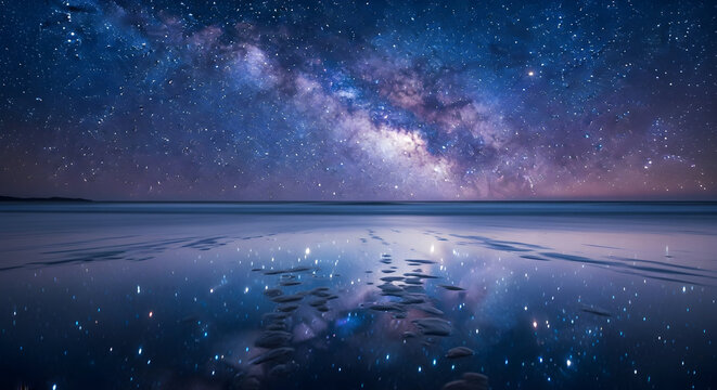 The night sea under a starry sky with the reflection of the galaxy in the water — for cover designs, meditation apps, and travel websites.