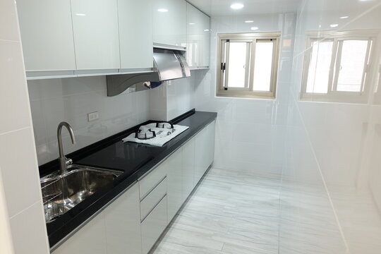 Renovated white galley style kitchen in modern apartment