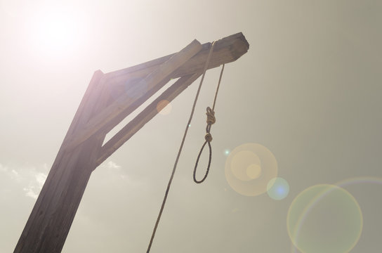 Rusted metal gallows with a frayed rope noose suspended ominously in a desolate, foggy landscape, evoking a sense