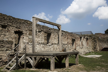 A woman in medieval dress prays against a cloudy dramatic sky. Place of execution with gallows and scaffold on the background of old houses