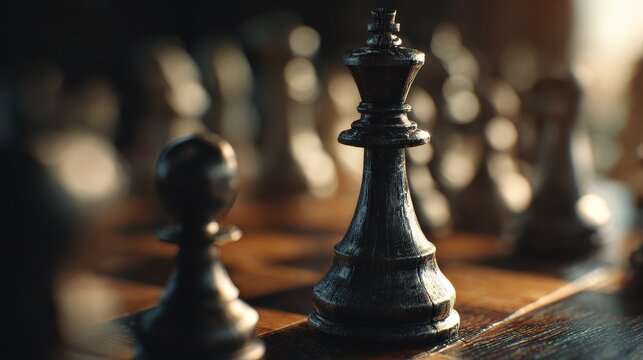 Strategic Focus - The Black King Illuminated by Dramatic Golden Backlight on a Chessboard.