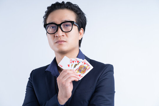 Professional, cunning magician, poker player, gambler in casual outfit, glasses with serious expression, holding deck of cards, standing over red background