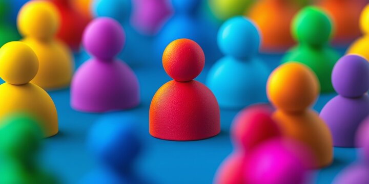 Distinctive red game piece stands out among colorful figures, highlighting individuality.