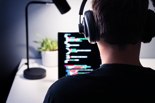 Young man mobile developer writes program code on a computer, programmer work in home office.