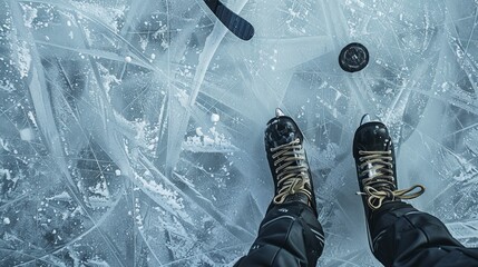 A close-up view of a pair of ice skates on a heavily scratched icy surface with a hockey puck in view, demonstrating the energy and dynamics of ice hockey.
