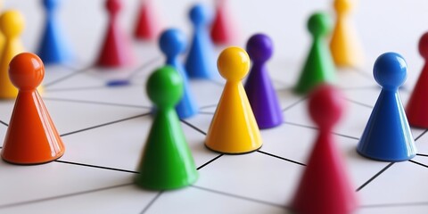 Various colored game pieces connected illustrate teamwork and collaboration within a networked environment.