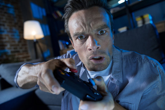 Gamer celebrating after winning gaming console game displayed on ultrawide smart TV. Man in apartment bragging after being victorious in videogame, completing level using gamepad