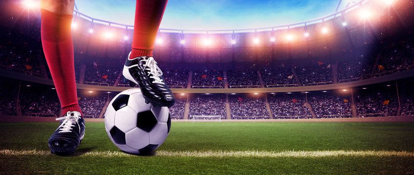 Immersive symmetrical view from the running track inside a modern athletics stadium, as if standing on the track at the center line.