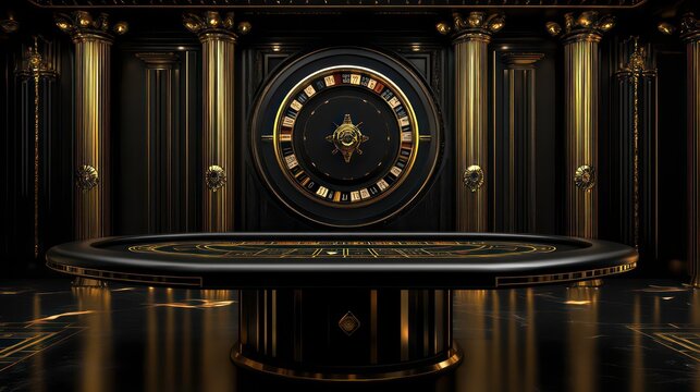 A black and gold roulette table in a luxurious casino setting with a large roulette wheel behind it.