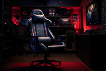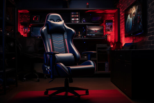 Modern gaming chair in dark room with red neon lighting and computer setup in the background