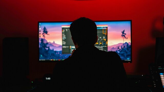 Focused gamer at a glowing gaming setup