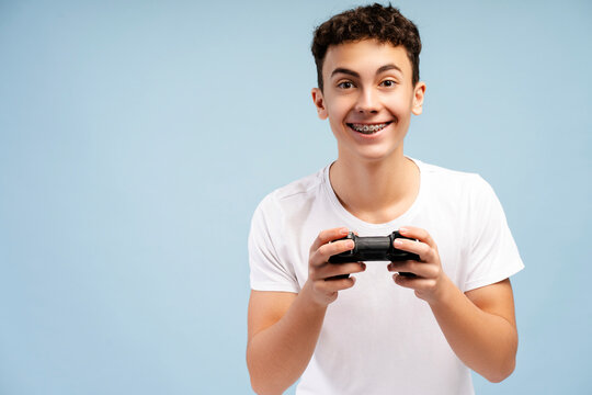 Smiling curly teen male with braces, holding a game controller and playing, isolated