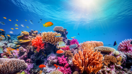 Transparent water of the ocean or sea, corals and fish underwater, seascape.