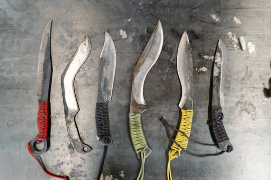 Handmade knives on metal table