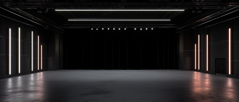 Black futuristic stage background, dark studio room and lines of white light, wide banner. Concept of show, scene, garage, panorama, modern interior, showroom