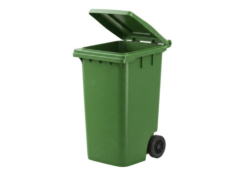 Isolated green recycling bin is standing and has its hinged lid open for discarding waste