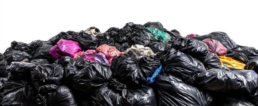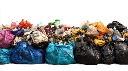 A pile of various colored garbage bags full of waste, underlining the problem of overconsumption and waste disposal