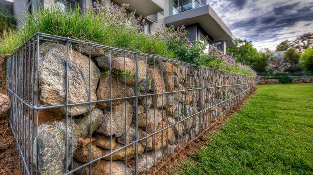 On perimeter of a rural garden the border is made of natural stones among which various ornamental plants grow.