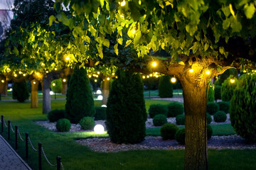 illumination garden light with electric garland of warm light bulbs on tree branches and ground ball lantern near thuja bushes on stone mulch, illuminate evening scene of outdoors park nobody.