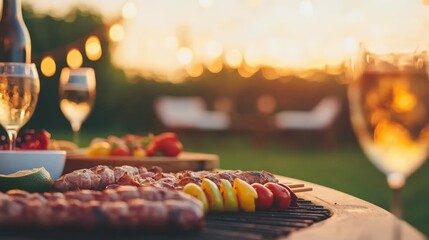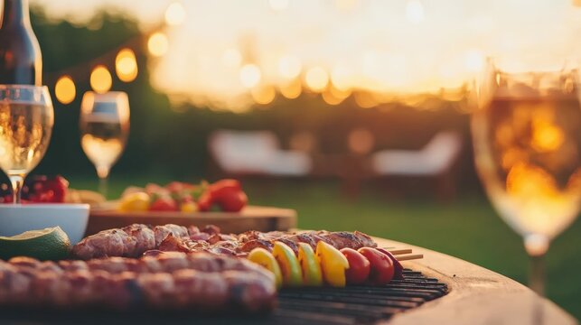 Summer evening barbecue gathering with grilled skewers and wine in a garden setting