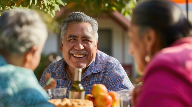 Diverse group of seniors enjoy relaxing outdoor picnic