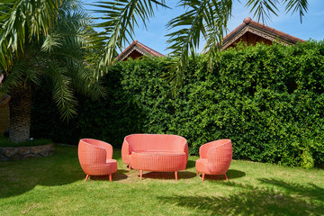 Garden patio decorated with Scandinavian wicker sofa and coffee table