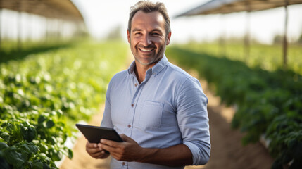 Farmer using tablet managing smart agriculture in greenhouse