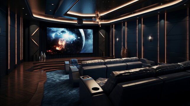 A plush home theater adorned with leather recliners, mood lighting, and a gargantuan screen.
