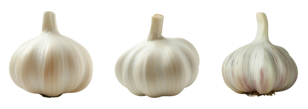 A whole fresh garlic head and clove segment isolated against a transparent background.