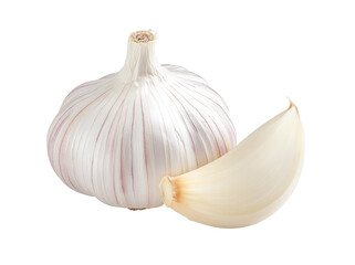 A whole fresh garlic head and clove segments isolated against a transparent background.