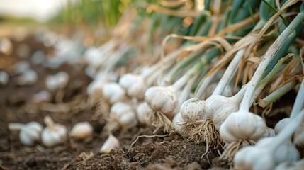Freshly harvested garlic bulbs lying in soil on a sunny day. Great for agriculture, farming, and organic food themes.