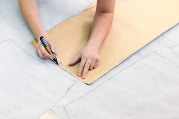Hands tracing sewing pattern on fabric for garment design