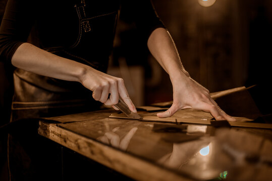 The cutter uses scissors to cut out patterns for clothing parts from paper.