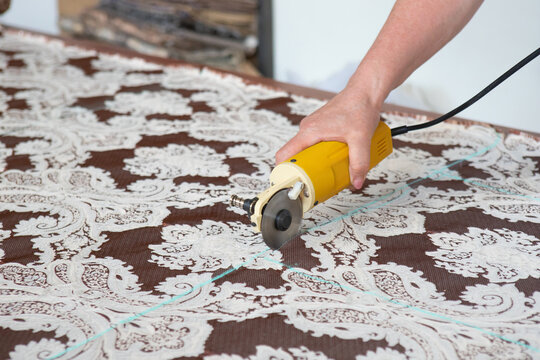 Female worker uses electric cutting fabric machine. Fabric industry production