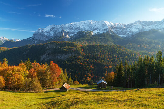 Garmisch-Partenkirchen - View to Alpspitz Mountain with View to Small and Big Waxenstein-Mountain  in colorful  Autumn Mood / Bavaria / Germany