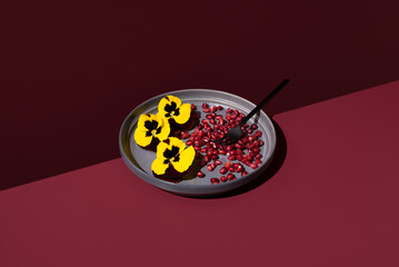 Edible Pansy Flowers and Pomegranate Seeds on Maroon Plate