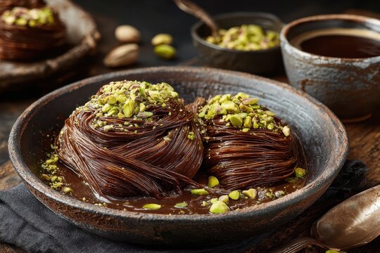 Delightful chocolate kadayif pistachio spread served in a rustic bowl surrounded by garnishments and a traditional beverage