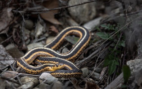 A close up of a Garter Snake, with head raised, on the ground amongst leaf litter