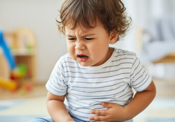 Young child experiencing abdominal discomfort, possibly from indigestion, gas, or constipation
