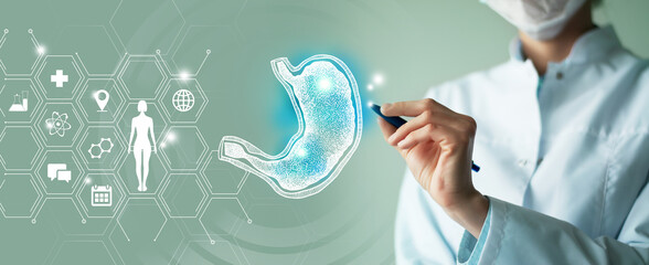 Unrecognizable female doctor holding graphic virtual visualization model of Stomach organ in hands. Multiple medical icons on the background.