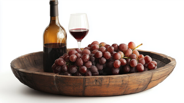 Elegant wine tasting setup with fresh grapes in wooden bowl against rustic background