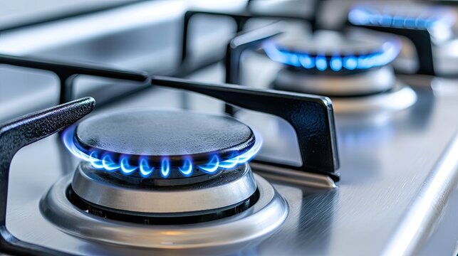 Blue flames ignite from a gas stove burner, illustrating the heat used for cooking meals in a cozy kitchen setting
