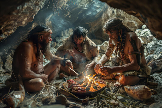 Tribe of Prehistoric Hunter-Gatherers Wearing Animal Skins Live in a Cave at Night. Neanderthal or Homo Sapiens Family Trying to Get Warm at the Bonfire, Holding Hands over Fire. Back View